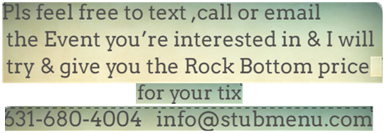 Pls feel free to text ,call or email the Event you're interested in & I will try & give you the Rock Bottom price for your tix